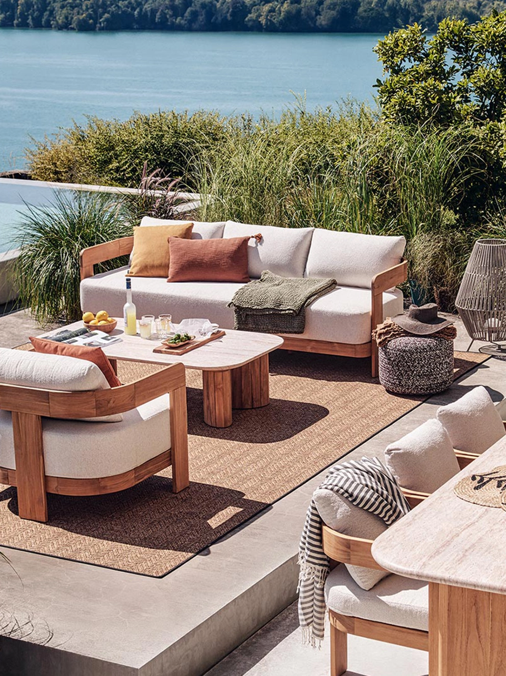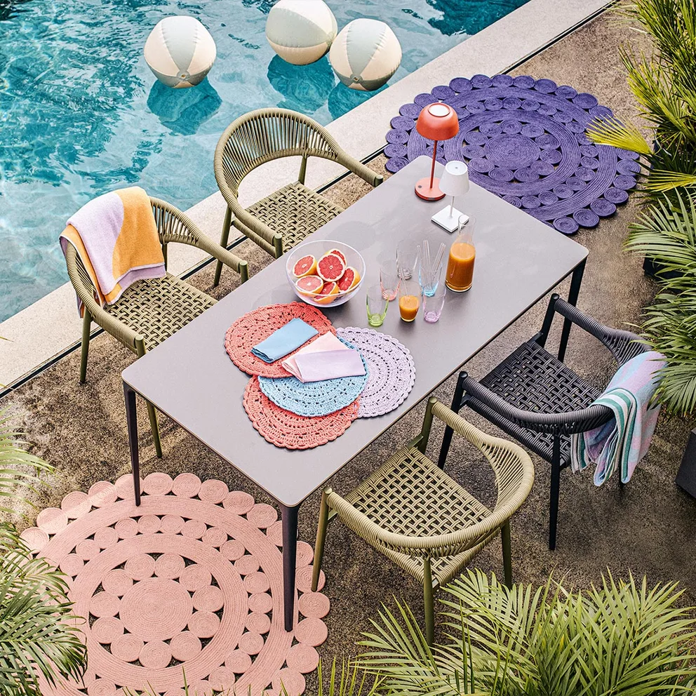 - Lounge-Bereich: Hier liegt der Fokus auf Komfort und einer Anordnung, die Geselligkeit und Gespräche fördert. Modulare Loungesessel, Liegestühle und Ecksofas kannst du immer wieder neu arrangieren. So entsteht ein Wohlfühlbereich, der zum Relaxen mit Freunden einlädt.