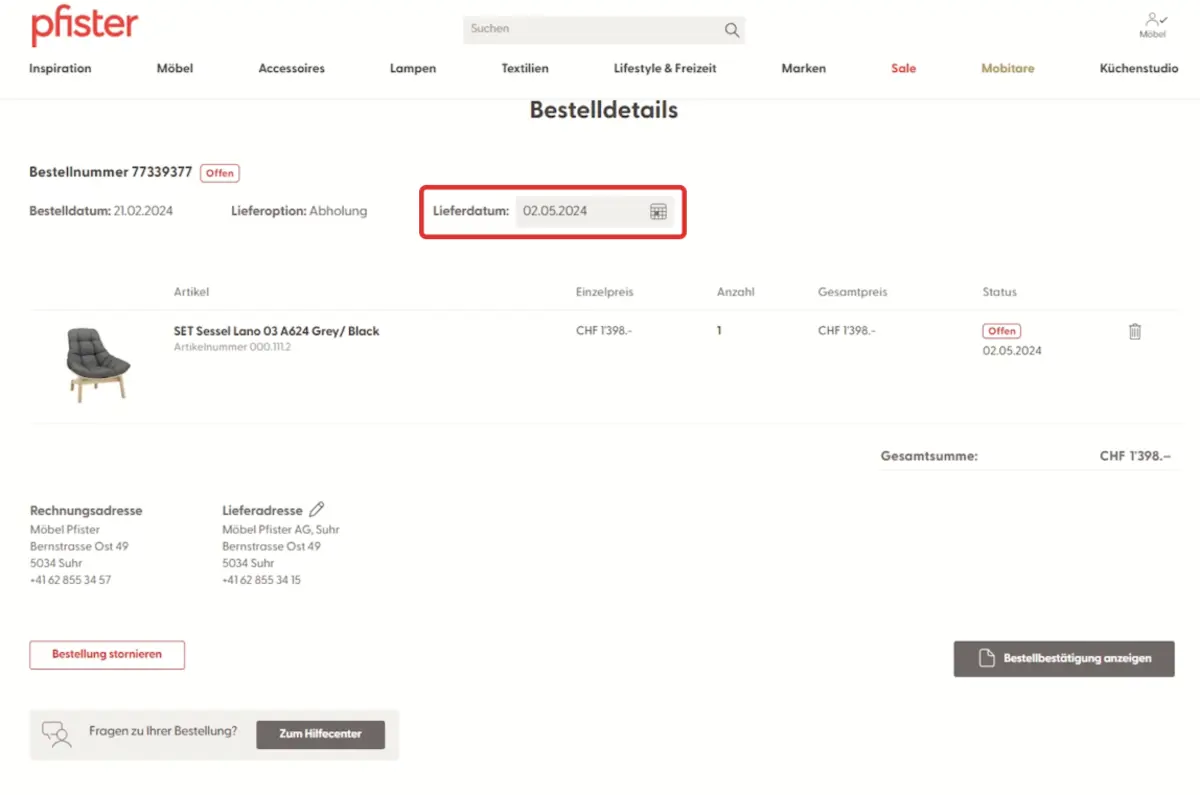 Diese Option steht Ihnen nur so lange zur Verfügung, wie die Bestellung mit Bestellstatus «offen» angezeigt wird. Diese Funktion steht nur Kunden mit einem Login zur Verfügung.