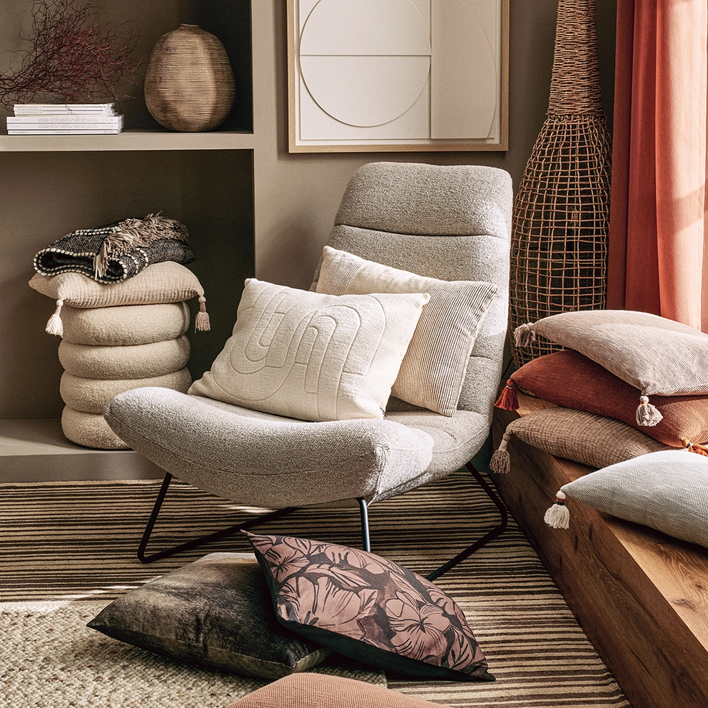 Was wäre ein einladendes Zuhause ohne eine Extraportion Gemütlichkeit? Mit Zierkissen, Plaids, Vorhängen und Teppichen in natürlichen Nuancen kreierst du eine stimmungsvolle Atmosphäre. Flauschige Kissen aus Cord oder Bouclé in warmen Tönen wie Curry, Rost oder Creme sowie Plaids aus Wolle oder Baumwolle laden auf der Couch, im Lesesessel oder im Bett zum entspannten Verweilen ein. Weiche Teppiche mit Struktur in schlichtem Beige oder als Farbakzent in kräftigem Gelb oder Grün schaffen eine wohnliche Basis und wärmen die Füsse an kühlen Tagen.