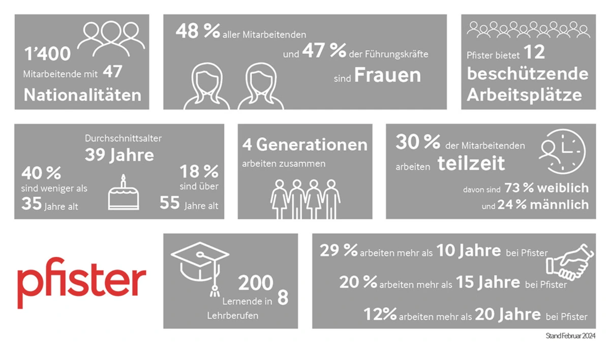 Glückliche Mitarbeitende tragen massgeblich zum nachhaltigen Unternehmenserfolg von pfister bei. Deshalb ist uns ein wertschätzendes und von Toleranz geprägtes Miteinander genauso wichtig wie gegenseitiger Respekt, Chancen- und Lohngleichheit. Eine Karriere bei pfister bedeutet eine ausgeglichene Work-Life-Balance dank flexibler Arbeitszeitmodelle, aber auch die Möglichkeit, sich weiterzuentwickeln. Ob in Bezug auf den Einzelnen oder die angebotenen Leistungen – bei pfister wird Vielfalt grossgeschrieben.