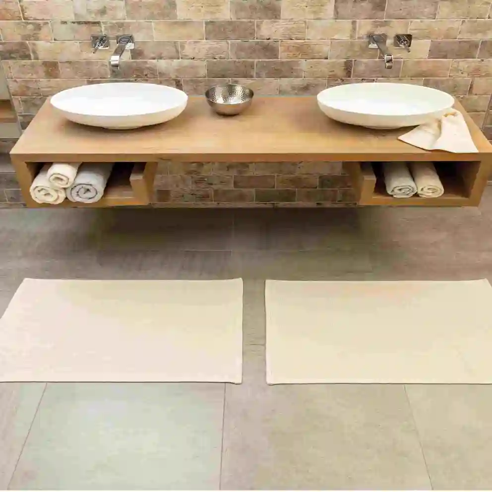 - Mischgewebe: Badteppiche, die aus Mischgeweben bestehen, vereinen die Vorzüge verschiedener Fasern. Ein Beispiel hierfür ist eine Mischung aus Baumwolle und Acryl, bei der die Baumwolle für Hautfreundlichkeit und Atmungsaktivität sorgt, während die Beimischung der Kunstfaser dazu beiträgt, dass die Matte in Form bleibt und zügig trocknet.