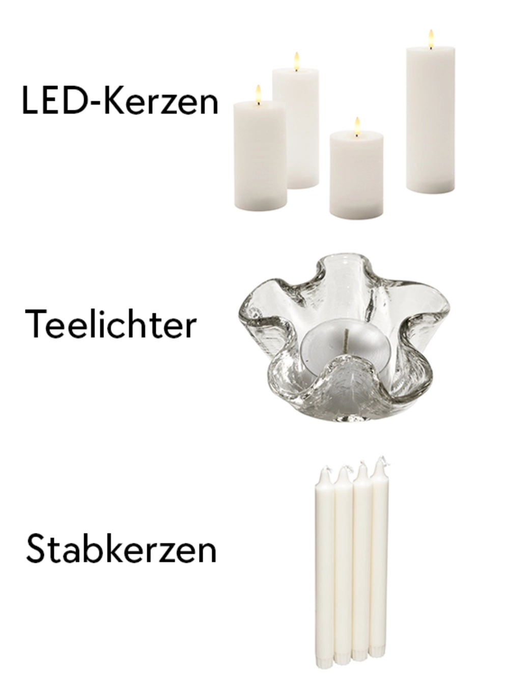 - LED-Kerzen: Wer Weihnachtskerzen sucht, die nicht streng beaufsichtigt werden müssen, ist mit LED-Kerzen für Weihnachten und Advent bestens beraten. Die batteriebetriebenen Lichtquellen sehen gewöhnlichen Kerzen sehr ähnlich, haben jedoch keine offene Flamme und erweisen sich somit als besonders sicher.