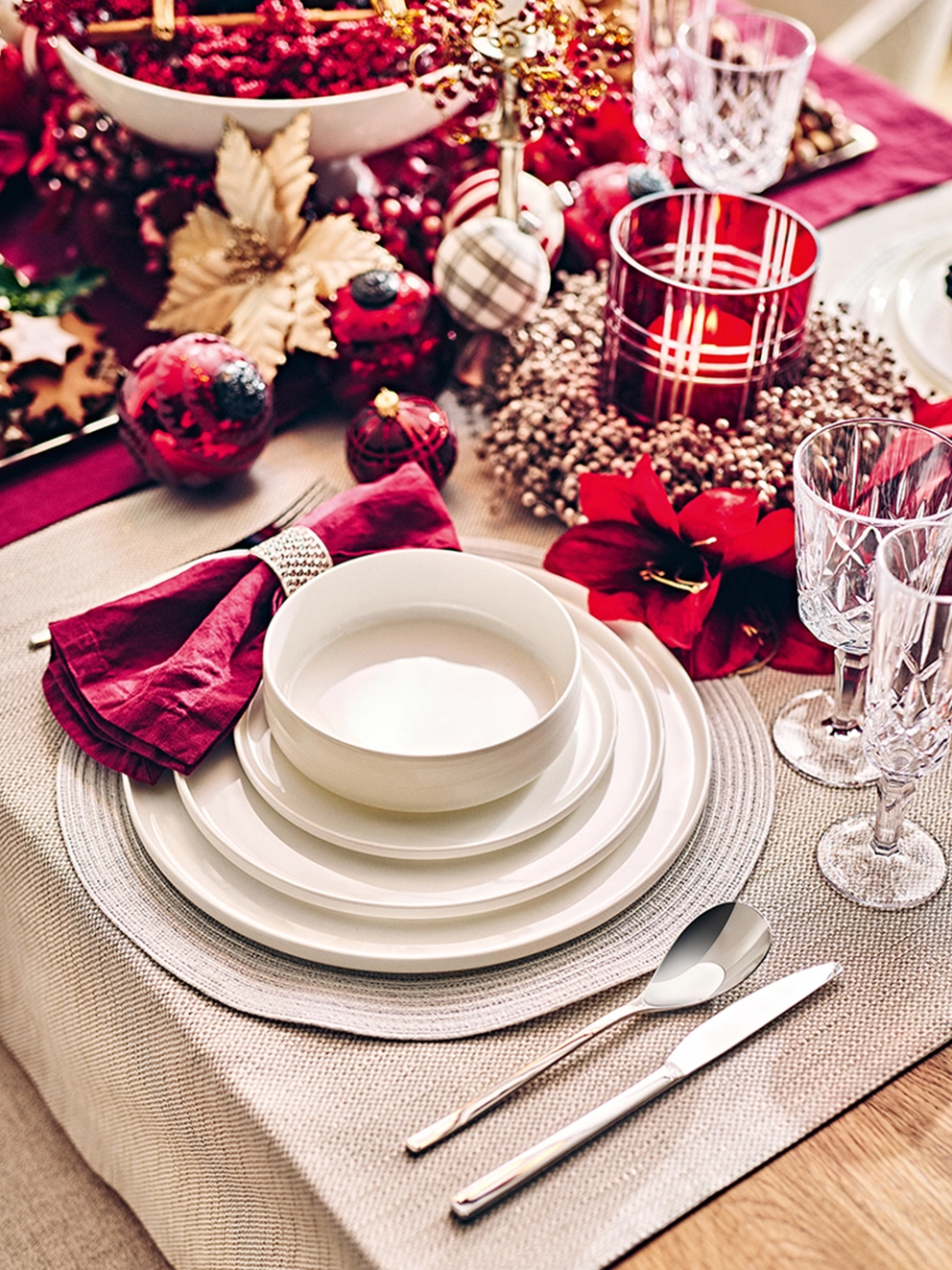 - Traditionell in Rot: Ein klassischer Weihnachtstisch lebt von satten Rottönen. Ob Kerzen, Tischwäsche oder ein üppiger Weihnachtsstern in der Mitte – hier kommt die kräftige Farbe voll zur Geltung. Als optischen Ausgleich wählst du das Geschirr und andere Akzente zum Beispiel in Weiss oder zurückhaltenden Naturtönen. Auch ein paar Highlights in Gold passen hervorragend zu einem solchen Arrangement.