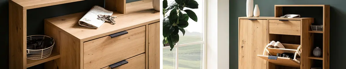 – Beliebt sind Schuhkommoden oder kleine Schuhschränke mit Türen. Sie verfügen über ausreichend Fassungsvermögen für deine Sandalen, Sneaker und Stiefel und halten zumeist noch zusätzliche Schubfächer für Schuhpflegeprodukte oder Schnürsenkel bereit. Dank der geschlossenen Türen dieser Garderobenmöbel entsteht zudem ein ordentliches Gesamtbild im Raum.
