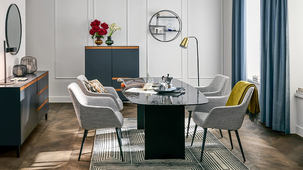 Das Kernstück jeder Esszimmereinrichtung ist ein einladender Tisch. Ob zum Frühstück oder Abendessen, für Aktivitäten wie Basteln und gemeinschaftliches Spielen oder gar als Arbeitsplatz im Homeoffice – am Esstisch verbringen wir in der Regel viel Zeit. Umso wichtiger ist es, ein Möbelstück zu wählen, das funktionalen sowie ästhetischen Ansprüchen gerecht wird. Wenn du nur wenig Platz in deinem Apartment zur Verfügung hast, fügt sich ein zierlicher Bistrotisch unaufdringlich in die Umgebung ein. Runde Tische punkten mit ihrem geselligen Charakter, während sich rechteckige Exemplare besonders gut als Arbeitsfläche eignen. Wenn du flexibel bleiben möchtest, kommt ein ausziehbarer Esstisch infrage: Im Alltag beansprucht diese Variante nicht allzu viel Stellfläche. Lade deine Gäste ein und koche dein ganzes Menü, denn die Tischplatte lässt sich im Handumdrehen erweitern.