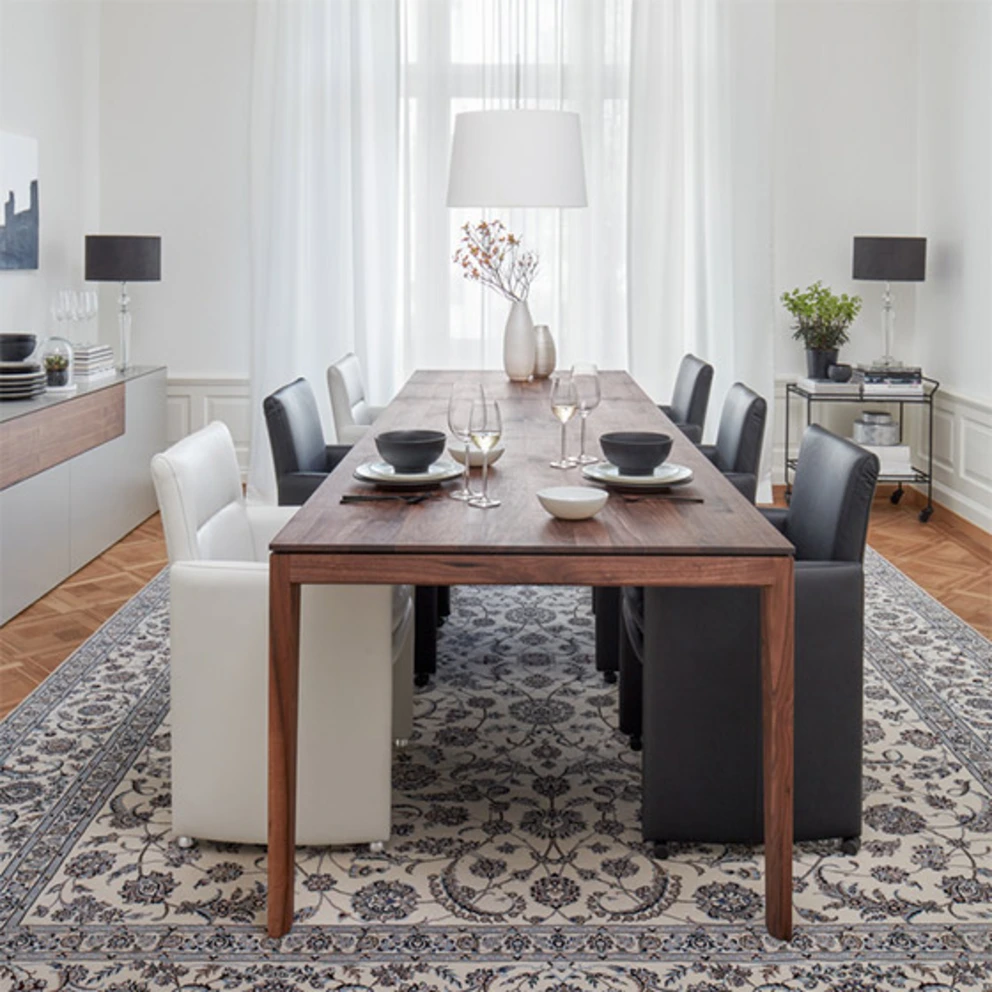 Grundsätzlich sind Ausziehtische rund oder rechteckig. Ein runder Esstisch, der ausziehbar ist, erhält durch die Vergrösserung meist ein ovales Format, besticht aber weiterhin mit seiner geschwungenen Silhouette. Viele Einrichtungsfans schwärmen für diese Tischform, da sie sich optisch harmonisch ausnimmt und ihr eine kommunikationsfördernde Wirkung nachgesagt wird. Doch auch eckige Esstische haben ihren Reiz und können durch ihre markanten Konturen zum Blickfang werden. Entscheide am besten nach deinem Geschmack und danach, welche Form zu deinem Interieur passt.
