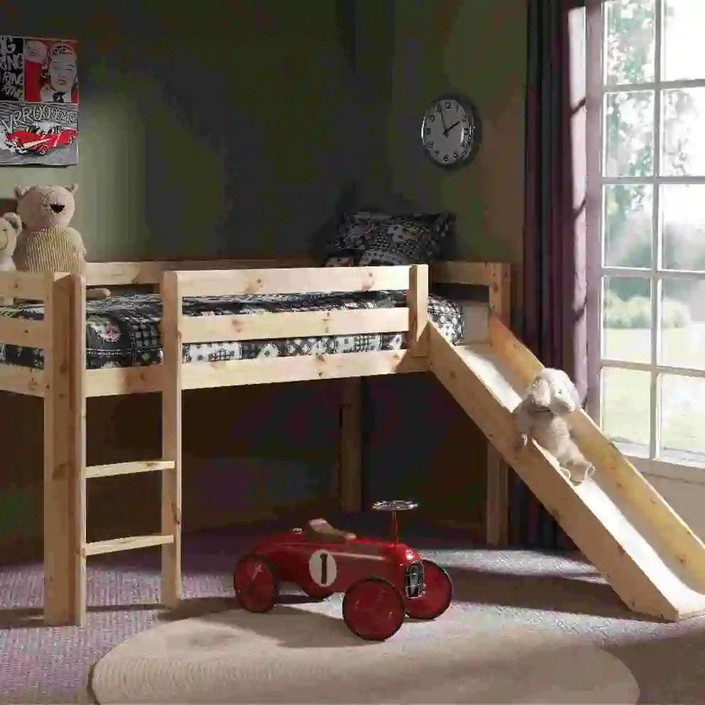 - Halbhochbett: Etwas weniger hoch hinaus geht es bei einer halbhohen Version, deren Liegefläche in einer Höhe von höchstens 150 cm angesiedelt ist. Solche Hochbetten erhältst du oft als sogenannte Spielbetten mit einem kindgerecht gestalteten Rahmen oder zusätzlichem Dekor wie bunten Vorhängen oder einer Rutsche. Sie lassen das Kinderzimmer zum Abenteuerspielplatz werden.