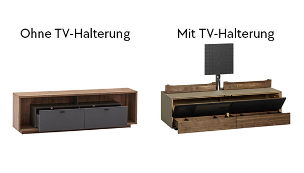 Prinzipiell kannst du TV-Möbel danach unterscheiden, ob sie über eine eigene TV-Halterung verfügen oder nicht. Der Vorteil einer speziellen Haltevorrichtung für den Fernseher ist, dass dieser fest installiert und somit kippsicher befestigt wird. Viele TV-Halterungen sind zudem dreh- oder schwenkbar, sodass du den perfekten Winkel zum Fernschauen individuell einstellen kannst.