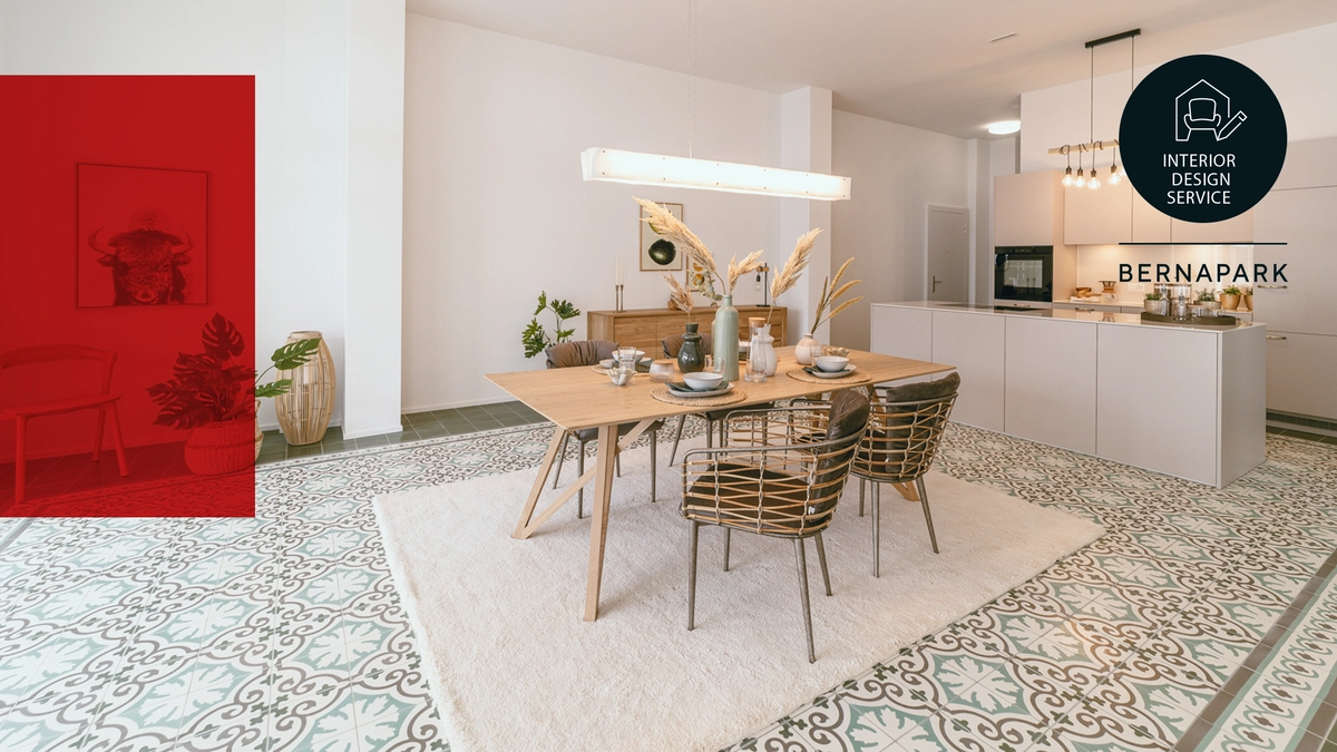 Sechs Wohnungen des Bernaparks sind mit einem aussergewöhnlichen, ornamental gestalteten Fliesenboden ausgestattet. Die Besitzer einer dieser Wohnungen wandten sich an das Pfister Interior Design Team, um ein passendes Einrichtungskonzept auszuarbeiten. Die Familie wünschte sich Räume, die Geborgenheit, Naturverbundenheit und Individualität ausstrahlen. Die Wahl fiel auf eine Einrichtung im mediterranen Stil mit Details im spanischen Kolonialstil.