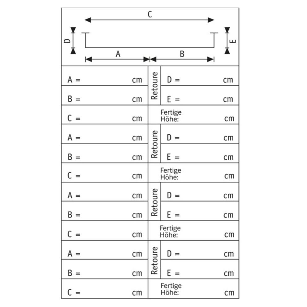 In die Felder A und B trägst du die Breite ein, wenn du einen zweiteiligen Vorhang wünschst. Für einen einteiligen Vorhang trägst du die ermittelte Breite im Feld C ein. Benötigt dein Vorhang Retouren, also seitliche Wandabschlüsse, trage die Masse dafür in die Felder D für die linke Fensterseite und E für die rechte Fensterseite ein.