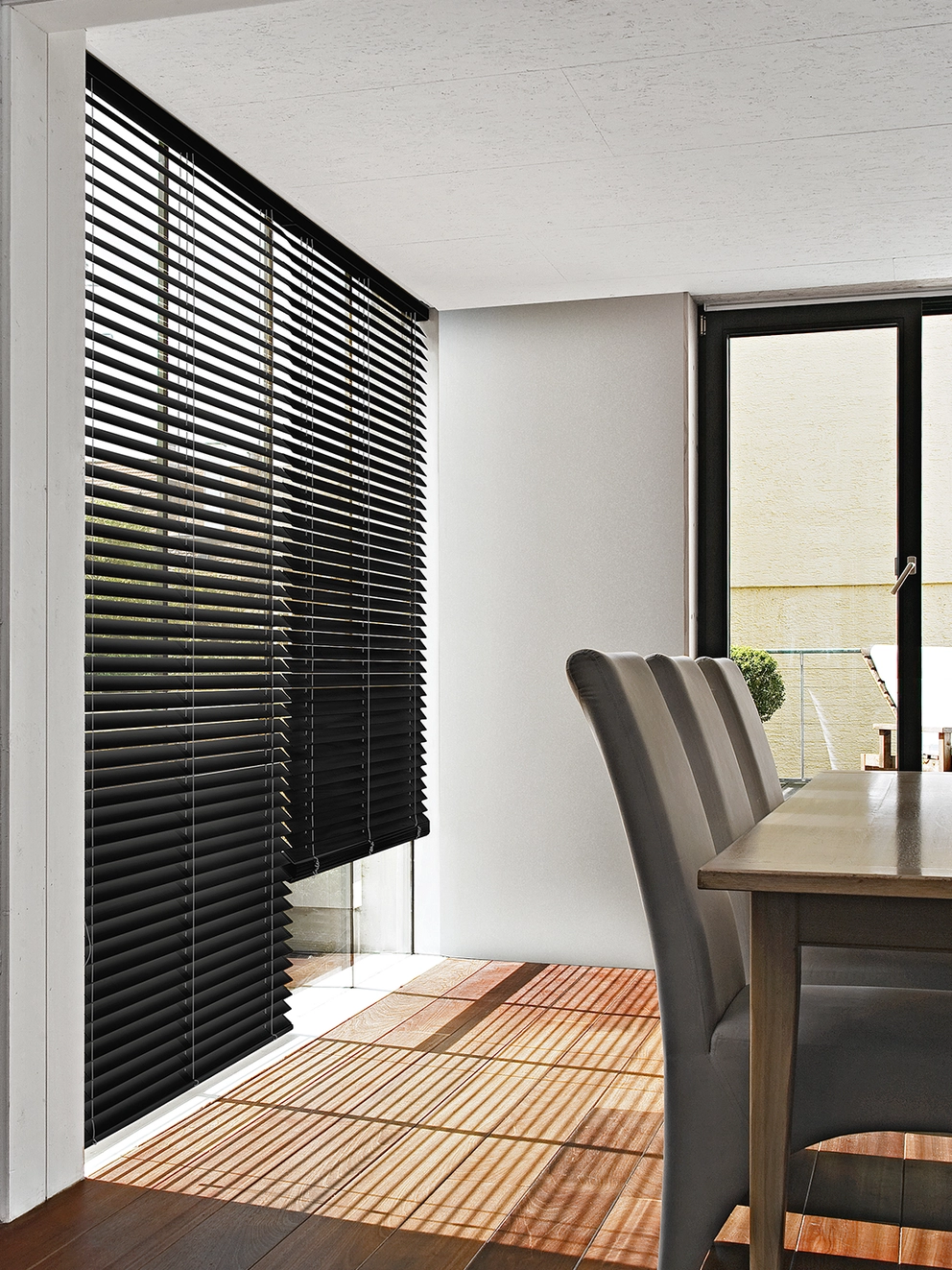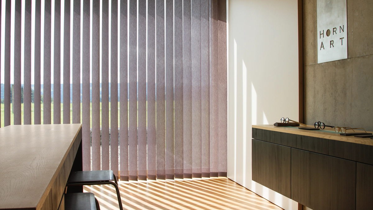 Stehen die Lamellen waagerecht, gewähren sie eine nahezu freie Sicht nach draussen. Eine senkrechte Positionierung sorgt für Privatsphäre und Schutz vor Sonneneinstrahlung. Besonders elegant zeigen sich Modelle mit 16 mm breiten Lamellen.