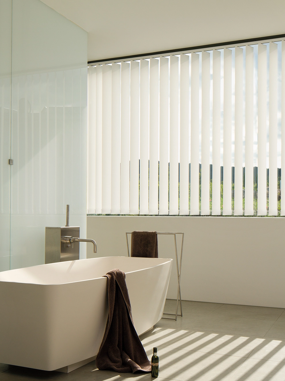 Auf äusserst dekorative Weise lassen sich mit Vertikal-Lamellen der Lichteinfall in den Raum und die Durchsicht nach aussen präzise regulieren. Die schmalen, senkrecht arrangierten Lamellen bestehen zumeist aus Stoff oder PVC. Befestigt an einer Schiene können sie nach Belieben gedreht und verschoben werden.