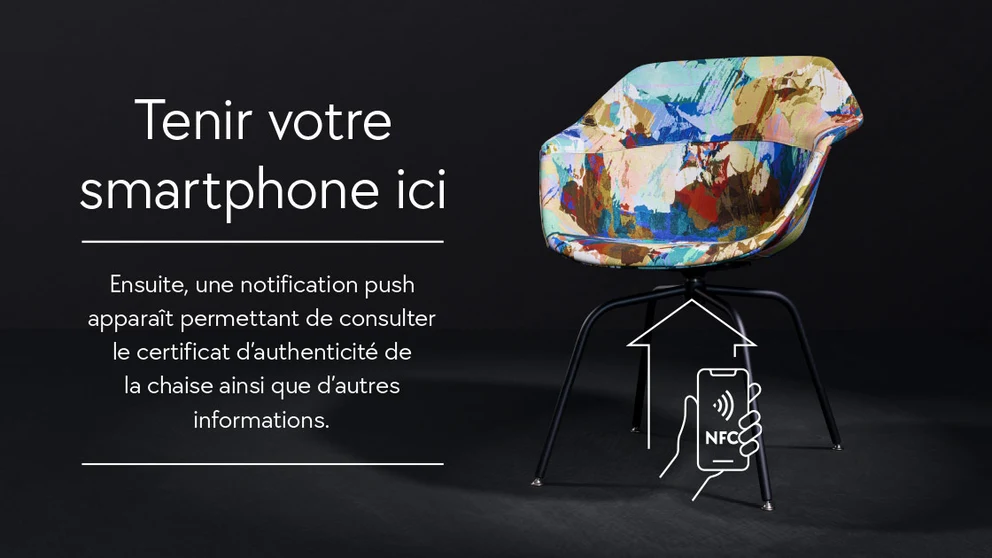 Chacune des 100 chaises Wila a un tag NFC cousu sous le siège. NFC (Near Field Communication) permet une communication sans fil avec un smartphone. En scannant le tag NFC, l’utilisateur est redirigé directement vers un site Internet spécifique contenant des informations détaillées sur la chaise et l’histoire de sa création. Comme le tag NFC est relié à un NFT sur la blockchain, l’utilisateur peut aussi consulter le certificat d’authenticité numérique.