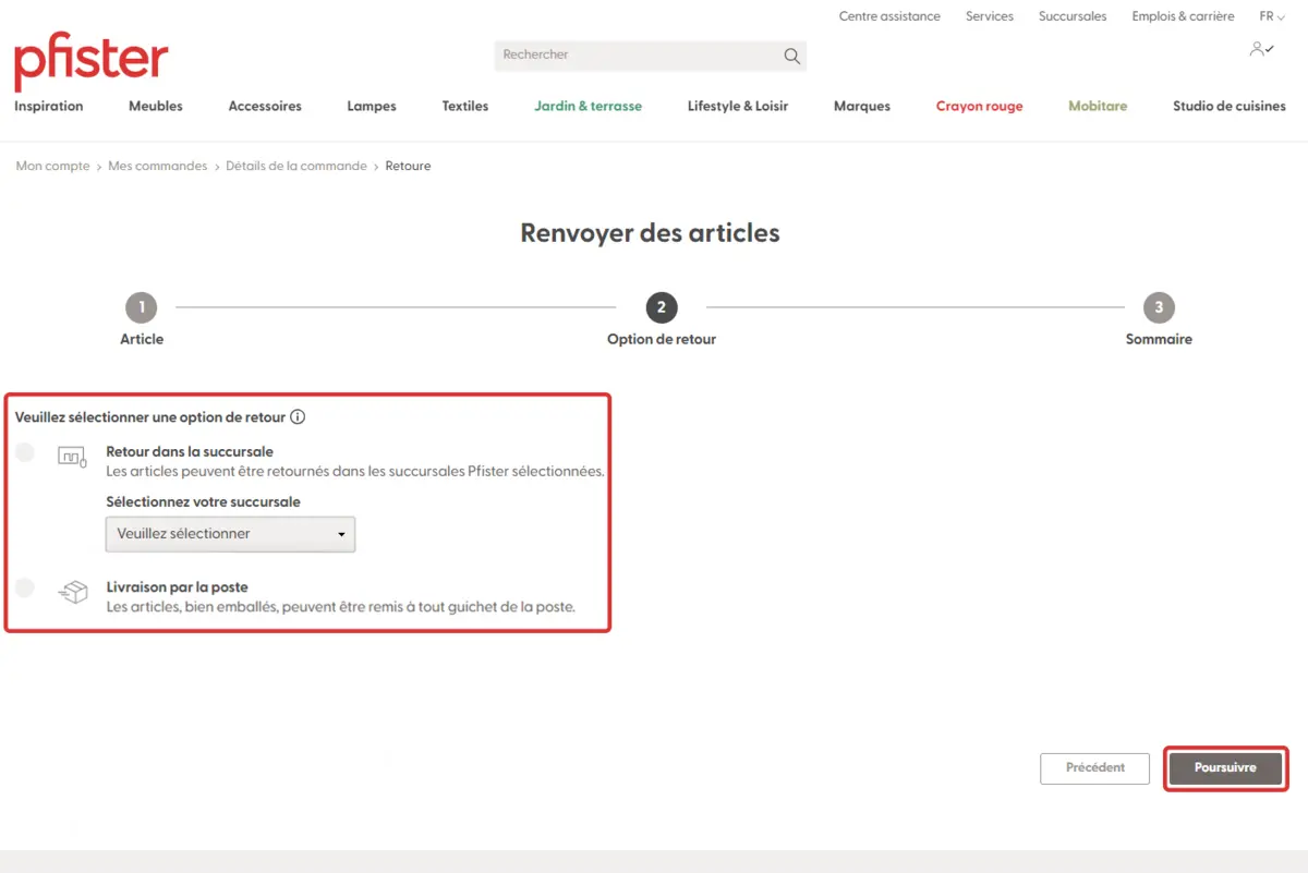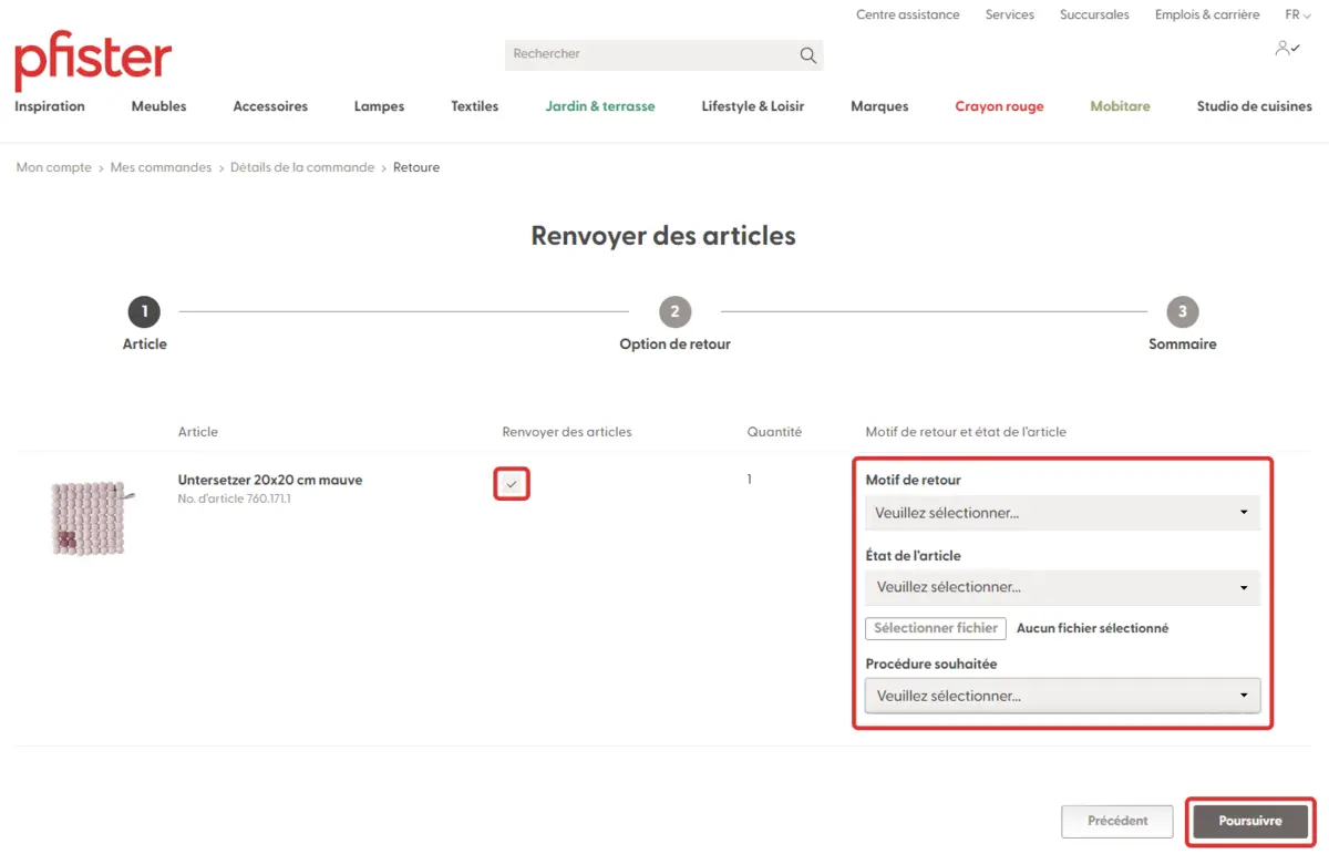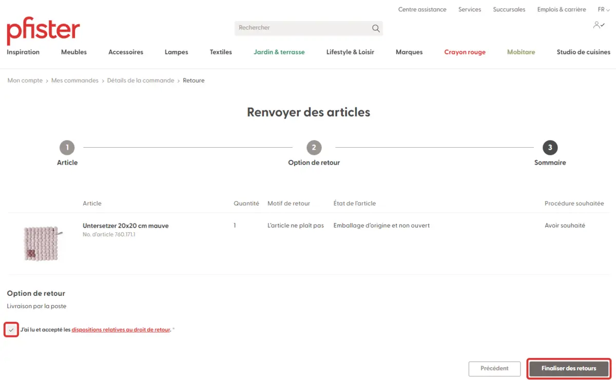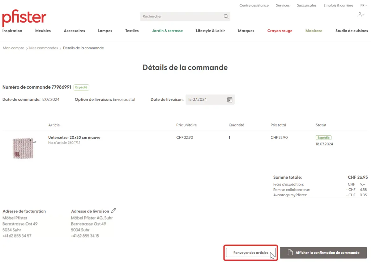 3. Cliquez sur «Renvoyer des articles» et indiquez l’article à retourner dans les 30 jours.