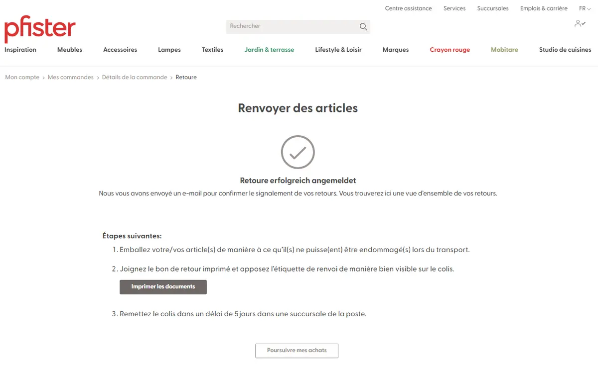 Il est possible de retourner les articles non exclus du droit de retour s’ils ne vous plaisent pas, sont défectueux ou vous ont été livrés par erreur. Pour retourner des articles à pfister, veuillez procéder comme suit: