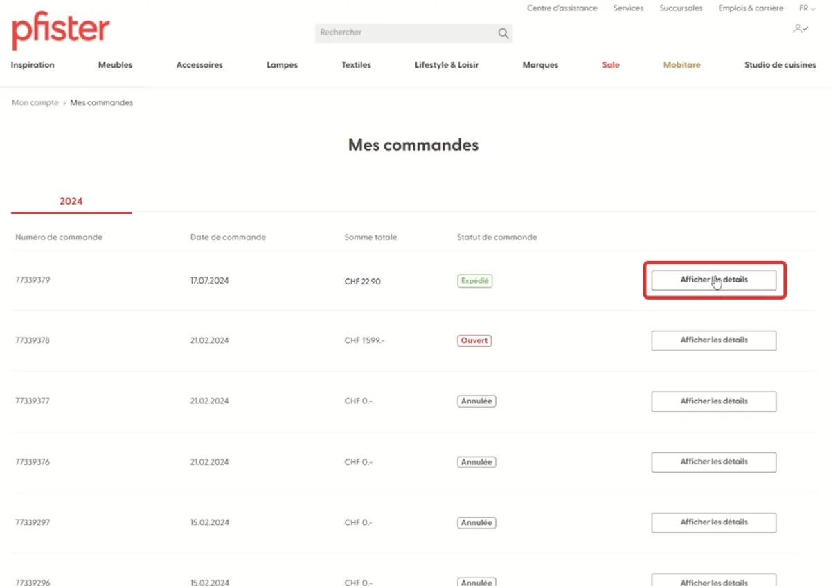 1. Connectez-vous à votre compte d’utilisateur sur pfister.ch à l’aide de la rubrique «Mon compte» et allez dans «Commandes».
