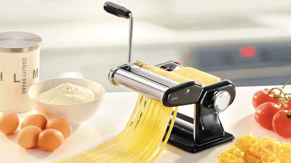 Avec la machine à pâtes PASTA PERFETTA, vous réalisez des pâtes parfaites. L'ustensile de cuisine en acier inoxydable est actionné mécaniquement et possède trois rouleaux pour les lasagnes, les tagliatelles et les tagliolini. La machine à pâtes de GEFU est robuste et durable et trouvera certainement une place d'honneur dans votre cuisine.