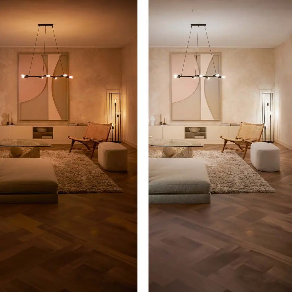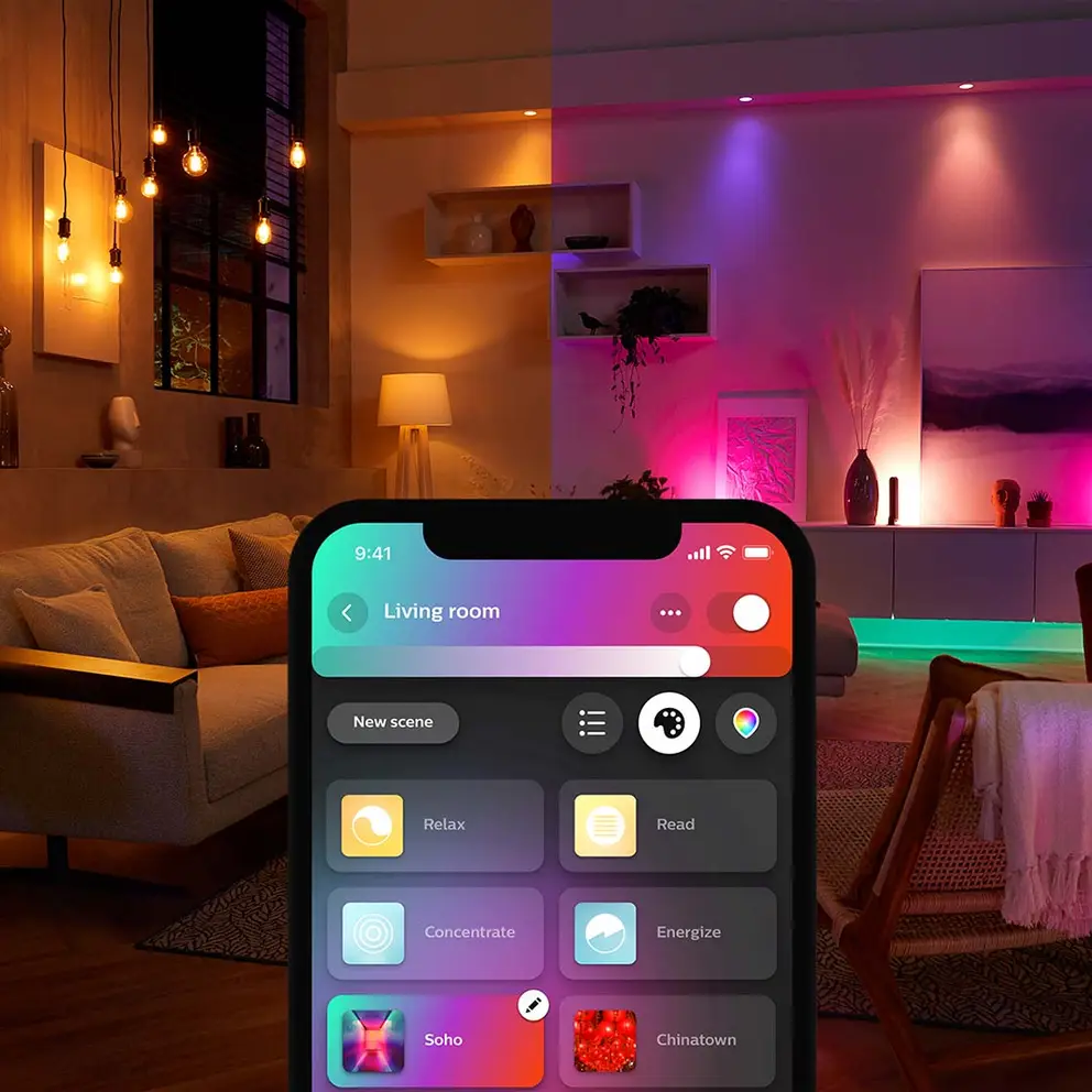intègre des lampes intelligentes avec options de variation de la couleur pour changer l’atmosphère d’une pièce ou utiliser des effets particuliers, pour créer une mise en scène dynamique, par exemple. Tu peux paramétrer les motifs de changement de couleur indépendamment pour chaque lampe dans une pièce et créer une ambiance lumineuse unique.