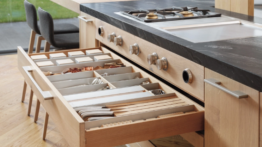 L’ordre dans la cuisine commence dès la planification. Des compartiments d’ustensiles variables pour les tiroirs et rayons extensibles jusqu’aux flux de travail ergonomiques, en passant par les grands éviers: découvre ici tout ce à quoi tu dois veiller lors de la planification pour faire régner l’ordre dans ta cuisine. En effet, pour que le travail en cuisine reste un plaisir à long terme, rien de mieux qu’une cuisine rangée et bien structurée.
