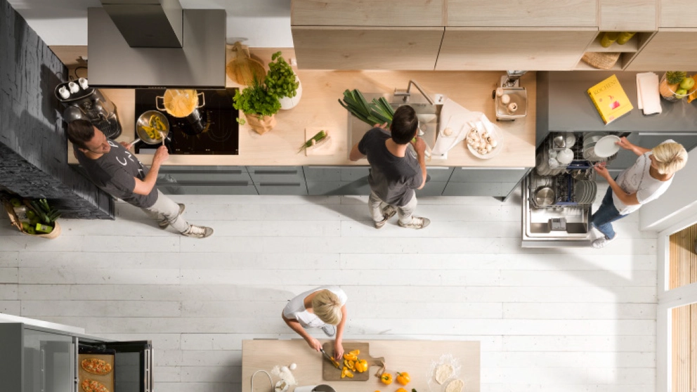 L’ordre dans la cuisine grâce à des flux de travail efficaces signifie que les personnes qui cuisinent ensemble ne se gênent pas les unes les autres. Une bonne planification implique également de réfléchir aux distances idéales à parcourir. La règle d’or est la suivante: la distance entre les secteurs réfrigération/stockage, cuisson et évier ne devrait pas dépasser deux longueurs de bras, mais fournir suffisamment de place pour deux cuisiniers. À cet égard, il est également important que les plans de travail soient à une hauteur optimale pour ménager ton dos. Les cuisines de Dieter Knoll offrent même la possibilité d’installer le four et le lave-vaisselle à hauteur de vue afin d’assurer des flux de travail ergonomiques, de la cuisson à la vaisselle.