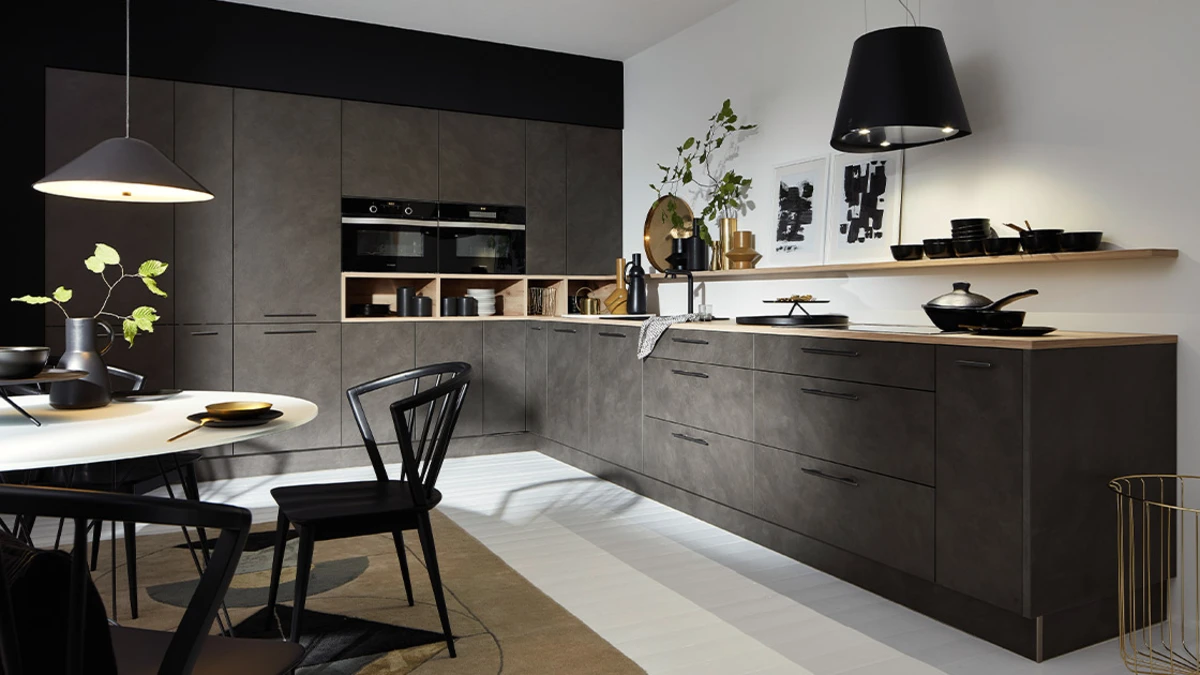 Black is beautiful: cela vaut également pour les cuisines en 2025. Des couleurs sobres et sombres permettent aux cuisines de se fondre dans le décor. La fonctionnalité est toujours assurée, tout en laissant de la place à un espace de socialisation convivial. Une finition mate supplémentaire, comme celle proposée par les modèles DK405 de DIETER KNOLL ou NX870 et NX950 de NEXT, confère une image encore plus élégante. Des accessoires colorés procurent à chaque cuisine une touche individuelle. Ceux-ci peuvent être modifiés selon les goûts et les saisons et contribuent immédiatement à l’ambiance de la pièce. Les surfaces sombres sont également agrémentées de verre fumé fin et de noyer de haute qualité, comme pour le modèle Black Line de TEAM 7.