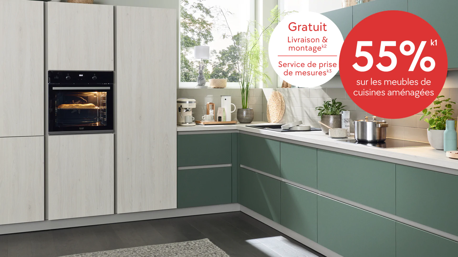 k² Promotion valable sur l’achat d’une cuisine aménagée dès 3500.–. Hors supplément de prix pour les zones de livraison.