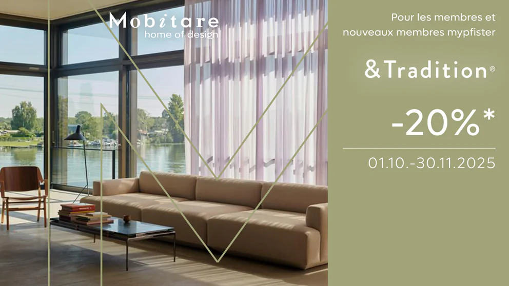 * Valable du 1.10.-30.11.2025. 20% sur Develius & Develius Mellow de &Tradition. Exclusivement pour les membres mypfister et les nouveaux membres. Non cumulable avec d'autres réductions et non valable pour les services, les chèques-cadeaux et les commandes déjà passées.