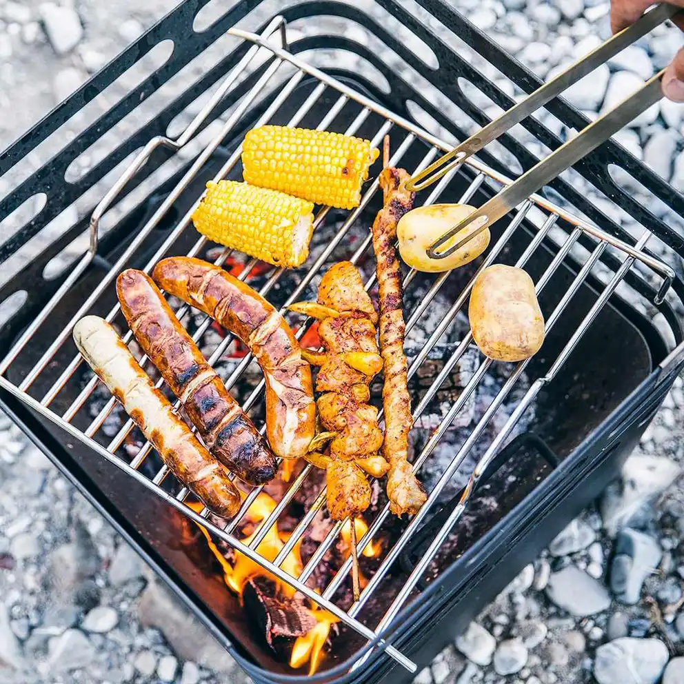 - Gril de table: prépare des délices grillées directement sur la table! Plus pratique que les grands modèles, un petit barbecue au charbon de bois pour le balcon ou la terrasse est la solution idéale sur les tables de jardin. Assis à table, tu peux confortablement retourner tes brochettes de viande et de légumes sur la grille à l’aide d'une pince. Afin d’éviter la formation de fumée, pense à vérifier qu’il n’y a pas de graisse en excès sur le charbon. Attention: utilise les barbecues au charbon de bois uniquement à l’extérieur!