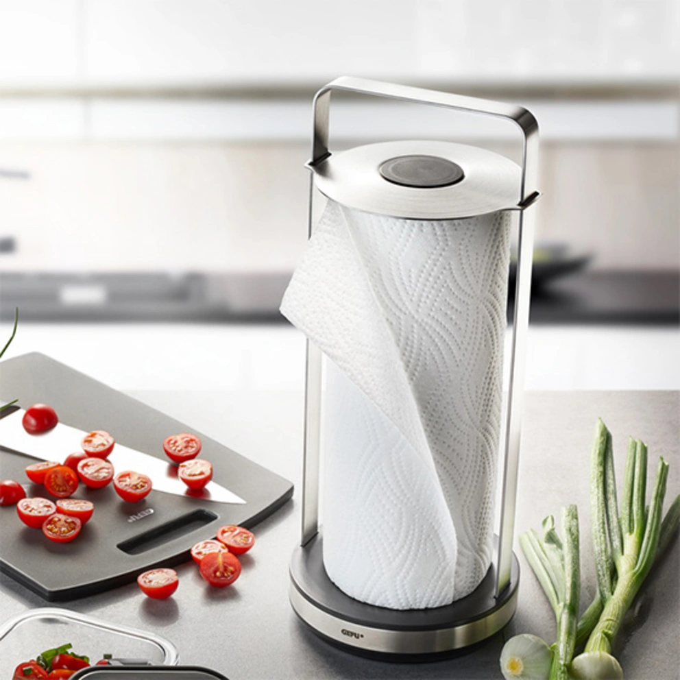 - Le rouleau d’essuie-tout sur le plan de travail ne cesse de tomber ? Le porte-rouleau d’essuie-tout vient à ton secours : ainsi, le papier absorbant reste toujours en place et les feuilles peuvent être déchirées d’une seule main.