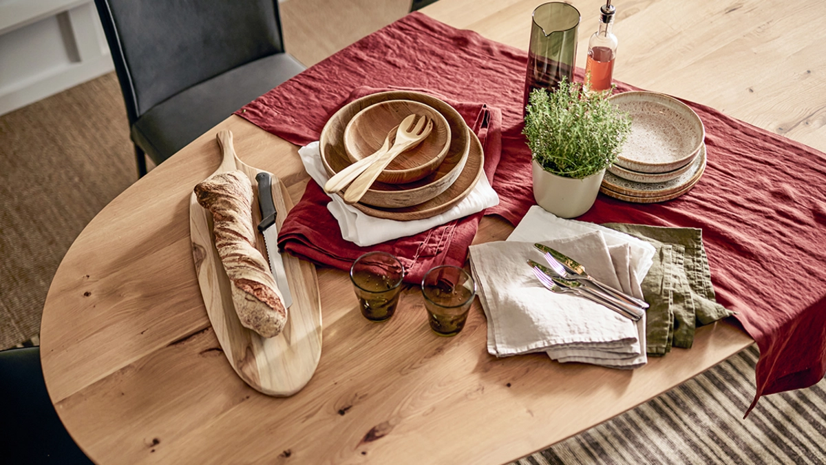 La vaisselle ne suffit pas à faire de ta table de salle à manger un lieu de fête soigneusement agencé. Ce sont les nappes et les chemins de table que tu choisis en fonction de la couleur et du style de ton intérieur qui en font la base. Une décoration de table soignée, incluant des serviettes mises en scène à l’aide d’élégants ronds de serviette, vient parfaire l’ensemble. C’est ainsi que naît entre tes quatre murs une table qui enchante chaque convive!
