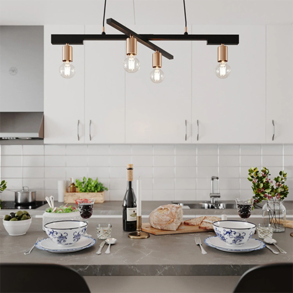Lampe à suspendre au-dessus du plan de travail de cuisine: En ce qui concerne le plan de travail dans la cuisine, la règle d’or est la suivante: on mange aussi avec les yeux et la sécurité doit être garantie. C’est pourquoi tu dois attacher de l’importance à l’éclairage optimal du plan de travail. À cet égard, nous te recommandons une source de lumière mate afin d’éviter la formation d’ombres trop accentuées. Grosso modo, la lampe à suspendre doit être installée 70 à 80 cm au-dessus du plan de travail de la cuisine. Attention de conserver une liberté de mouvement suffisante. Si tu as choisi plusieurs luminaires, les faisceaux lumineux doivent également se chevaucher sur le plan de travail.