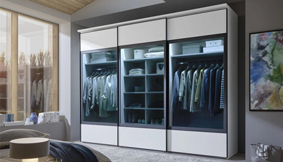 - Armoire à portes coulissantes en verre: l’armoire à portes coulissantes avec façades vitrées donne de l’éclat à la pièce – élégance et succès garantis.
