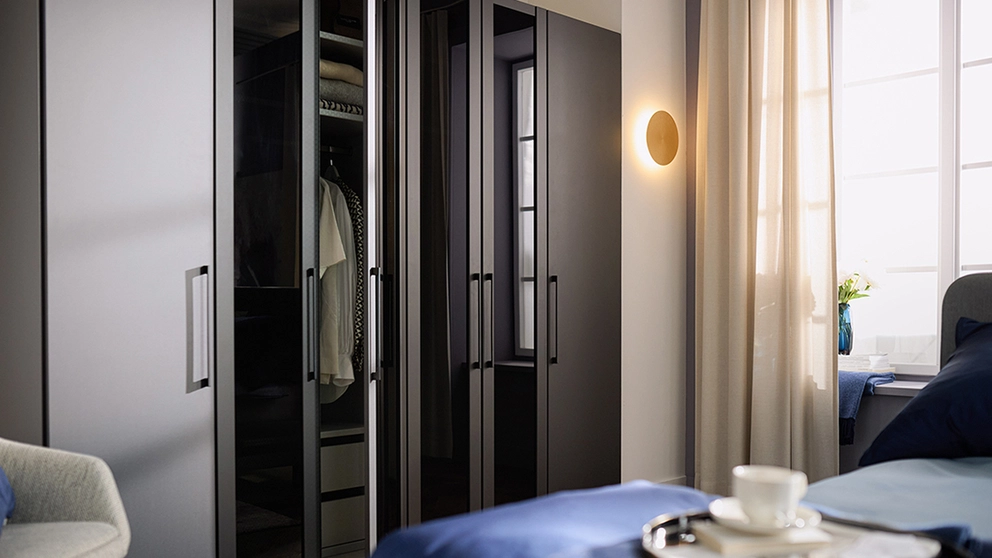 Les armoires se déclinent en de nombreuses variantes, chacune présentant des avantages différents. La désignation des différents types d’armoire donne déjà un indice quant à leur principal signe distinctif: le mode d’ouverture. Le principal atout des armoires à portes coulissantes réside dans leurs façades qui peuvent coulisser sur le côté, tandis que dans le cas des armoires à portes pivotantes, l’intérieur entièrement visible est appréciable. Si besoin, les portes simples et doubles peuvent être ouvertes en même temps, et offrir une vue d’ensemble du dressing. Les armoires à portes pivotantes sont habituellement dotées d’une tringle à vêtements et de compartiments ou de tiroirs. Par ailleurs, de nombreuses versions sont dotées de fonctionnalités pratiques: les tablettes réglables te permettent d’organiser les compartiments comme tu en as envie. Une armoire à portes pivotantes avec miroir te permet de vérifier ta tenue tout en agrandissant visuellement la chambre à coucher.