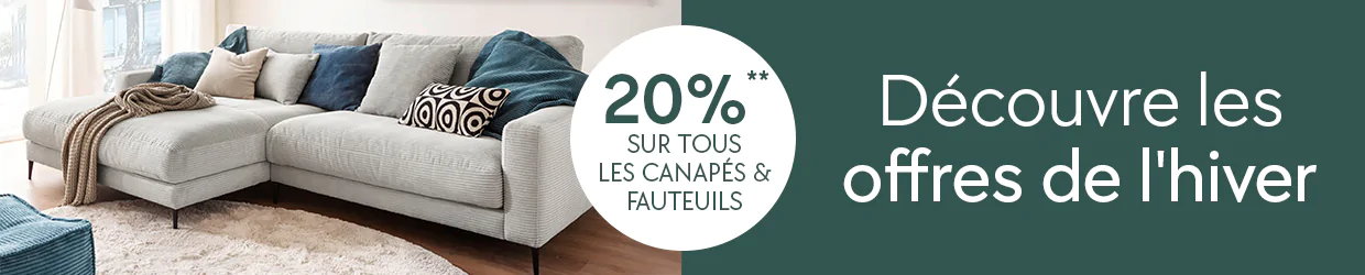 ** Valable uniquement pour les membres et nouveaux membres mypfister. 20% sur tous les lits Boxspring, canapés et fauteuils, meubles de bureau et lampadaires et sur toutes les chaises de salle à manger. Valable du 4 au 20.11.2025. Non cumulable avec d’autres réductions, non valable pour les marques Artemide, BICO, brühl, freistil, HAY, Intertime, Jori, Kartell, one, riposa, seetalswiss, Strässle, Stressless, TEAM 7, WILLISAU, ni pour les articles vendus uniquement en ligne, Mobitare, les services, les bons d’achat cadeau et les commandes déjà passées. Bonus membre mypfister de 2% inclus.