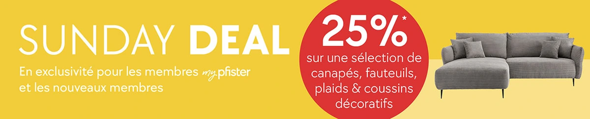 * 25% sur une sélection de canapés, fauteuils, plaids et coussins décoratifs pour les membres et nouveaux membres mypfister. Valable le 12.4.2026. Non cumulable avec d’autres réductions, non valable pour les marques brühl, freistil, Intertime, Jori, Kartell, Leolux, one, Strässle, Stressless et TEAM 7, ni pour les articles vendus uniquement en ligne, Mobitare, les services, les bons d’achat cadeau et les commandes déjà passées. Bonus membre mypfister de 2% inclus.