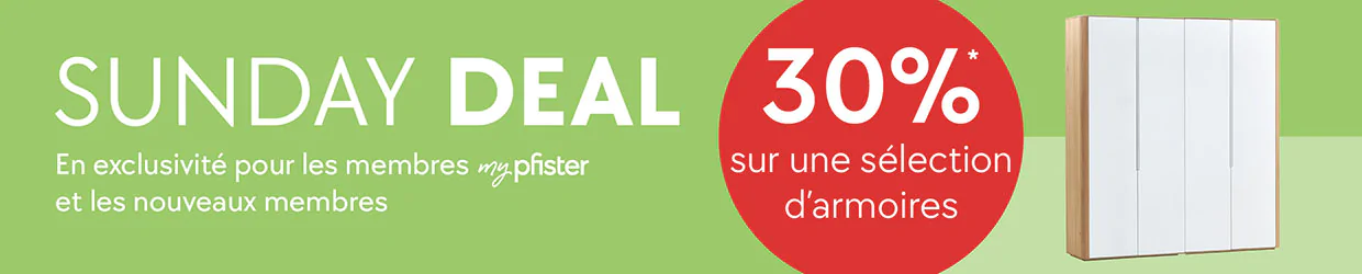 Toujours le dimanche. Seulement en ligne. Seulement pour les membres et nouveaux membres mypfister: le Sunday Deal pfister tu propose chaque dimanche une offre imbattable réservée aux membres. Ne manques pas de faire un tour dans notre boutique en ligne, car le dimanche est dorénavant le moment des bonnes affaires pour les membres mypfister! Tu n’es pas encore membre mypfister? Tu peux vite y remédier. Inscris-toi en ligne et profites dès maintenant. Outre des avantages exclusifs, tu bénéficies de 2% de remise à chaque achat.