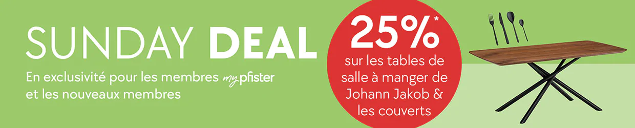 *25% sur les tables de salle à manger de Johann Jakob et les couverts pour les membres et nouveaux membres mypfister. Valable le 16.11.2025. Non cumulable avec d’autres réductions, non valable pour la marque one, ni pour les articles vendus uniquement en ligne, Mobitare, les services, les bons d’achat cadeau et les commandes déjà passées. Bonus membre mypfister de 2% inclus.