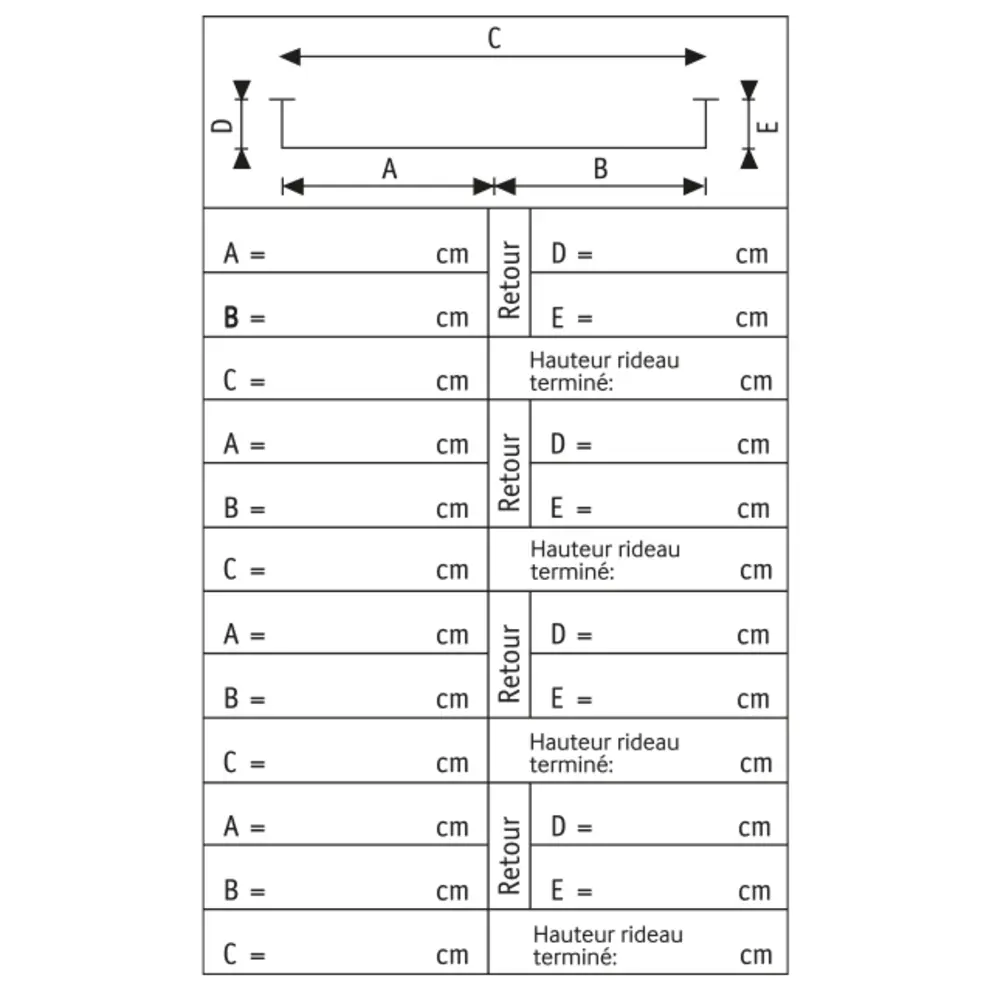 - Si ton rideau a besoin de retours, c’est-à-dire de raccordements latéraux au mur, inscris les mesures correspondantes dans les champs D pour le côté gauche de la fenêtre et E pour le côté droit.