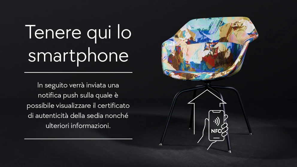 Ciascuna delle 100 sedie Wila ha una targhetta NFC cucita sotto il sedile. NFC sta per «Near Field Communication» e consente la comunicazione senza fili con smartphone. Durante la scansione della targhetta NFC, l’utente viene reindirizzato direttamente a una pagina web speciale contenente informazioni dettagliate sulla sedia e sulla storia della sua creazione. Poiché la targhetta NFC è collegata a un NFT sulla blockchain, l’utente può inoltre visualizzare immediatamente il certificato di autenticità digitale.