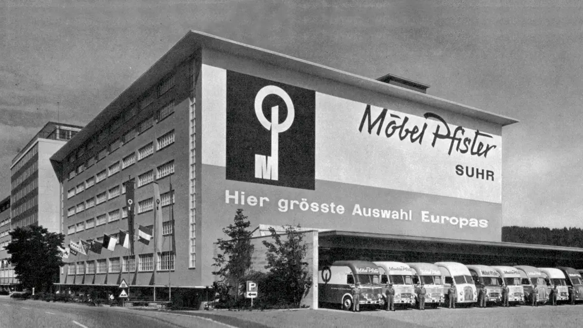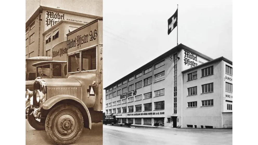 Viene acquistato il primo camion Pfister. Il raggio di azione delle consegne si espande dalla città alla regione. Oggi sono utilizzati circa 152 veicoli - dal camion al veicolo per le consegne da 3,5 t - per le consegne a domicilio e il montaggio fin nelle valli più discoste della Svizzera.