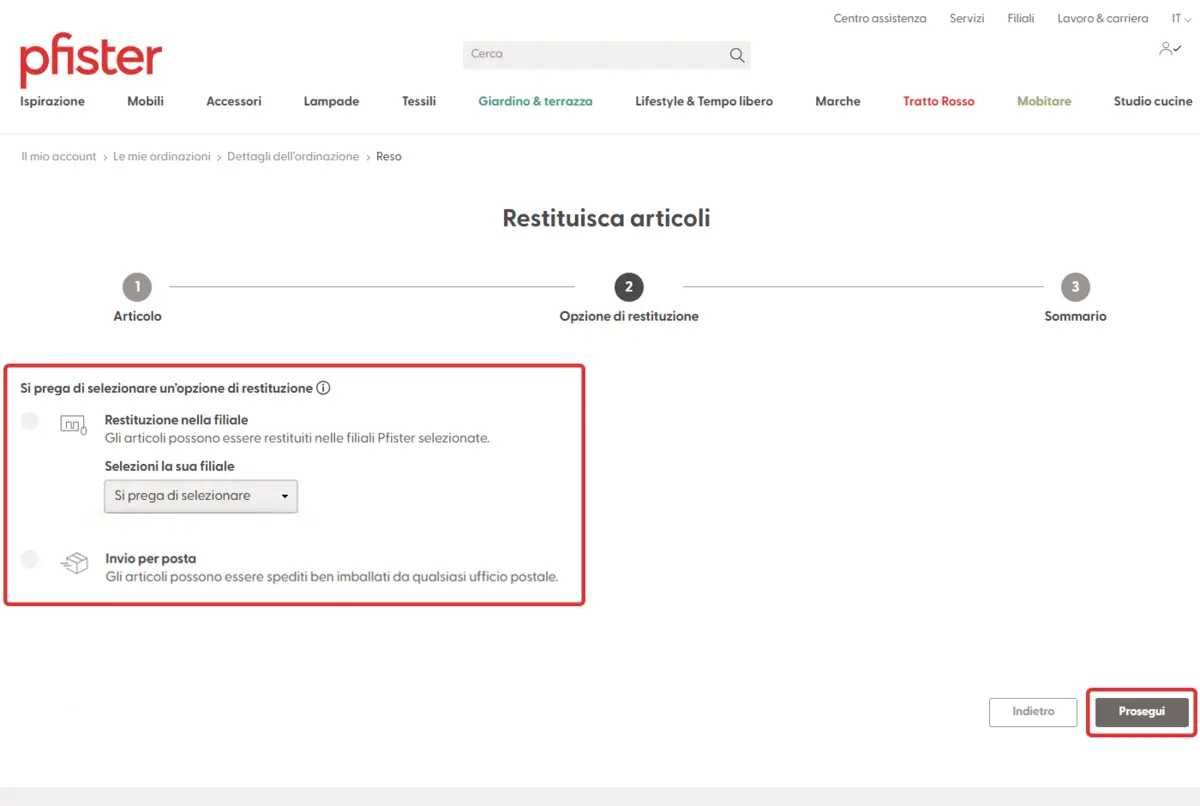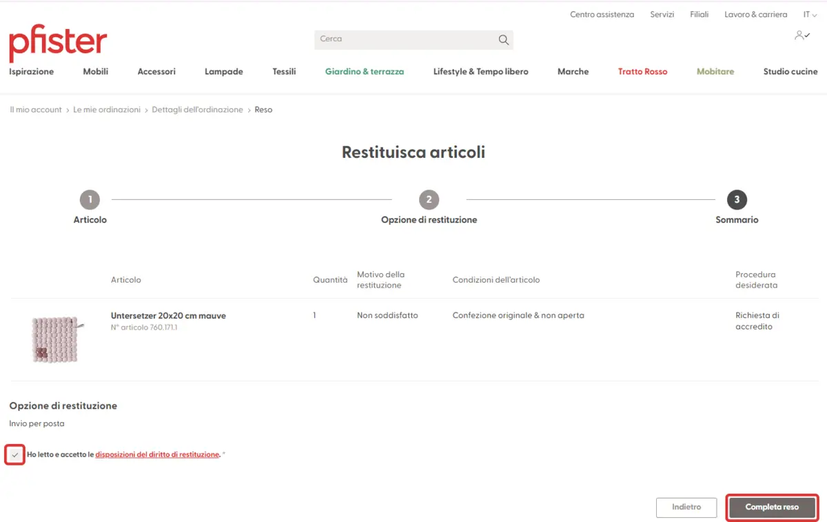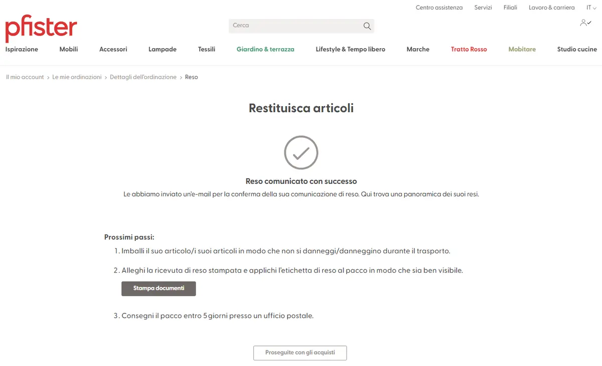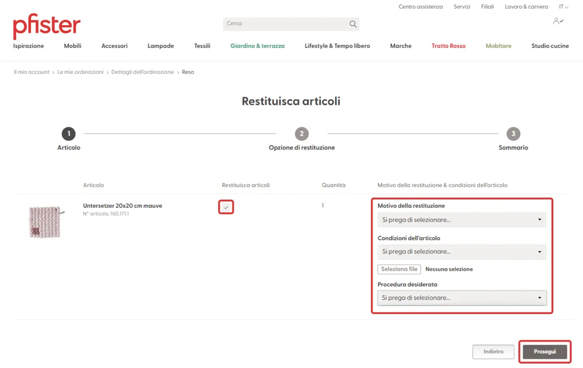 È possibile restituire articoli esclusi dal diritto di restituzione se questi non sono di vostro gradimento, sono difettosi o la consegna è errata. Ecco come restituire gli articoli a pfister: