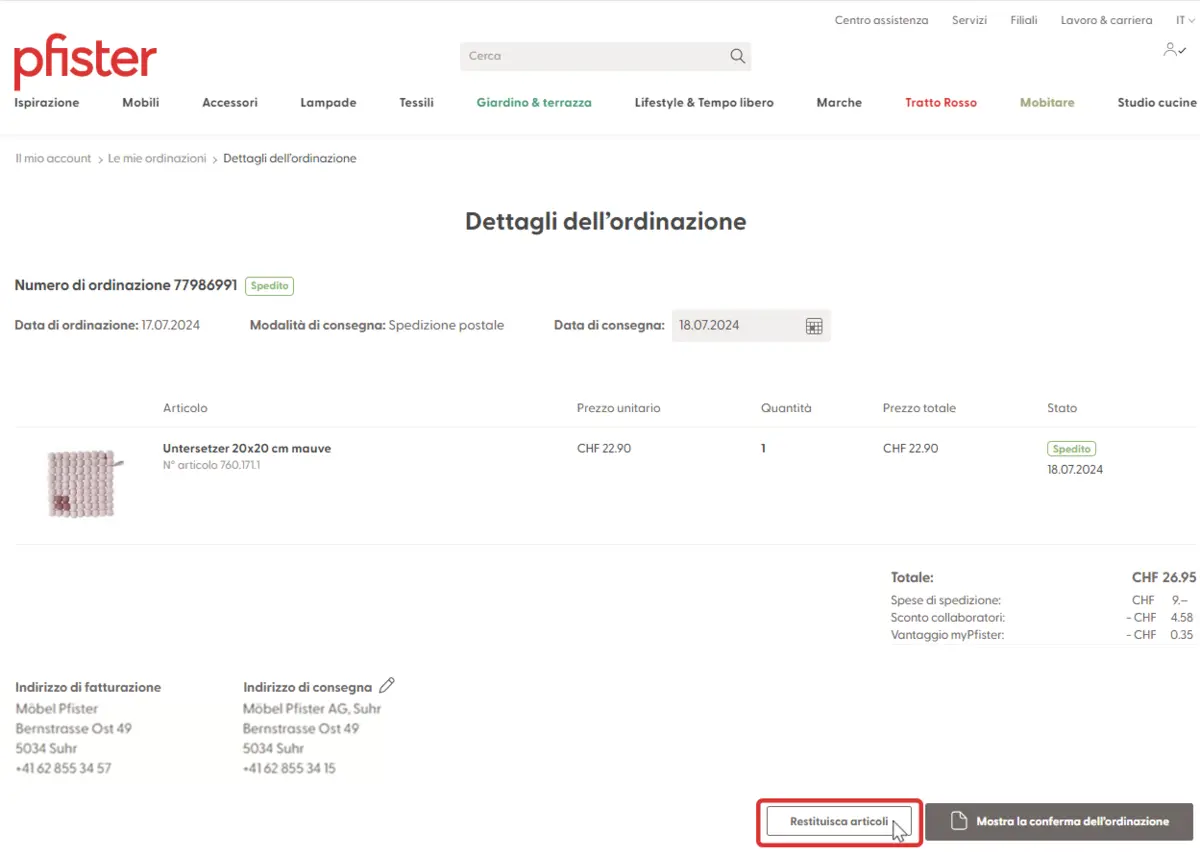 3. Cliccate su «Restituisca articoli» e, entro 30 giorni, registrate per il reso l’articolo desiderato.