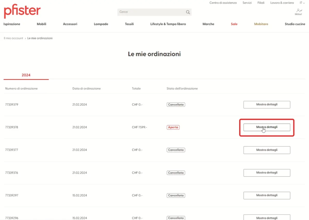 1. Selezionate l’acquisto in questione alla voce «ordinazioni».