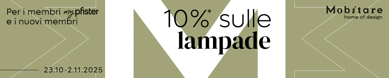 * 10% sulle lampade per i soci mypfister e i nuovi soci, valable du 23.10. - 2.11.2025. Non cumulabile con altri sconti e non valido per il marchio Baobab Collection e servizi, buoni regalo e ordini già effettuati. I soci mypfister beneficiano di un bonus aggiuntivo del 2%.