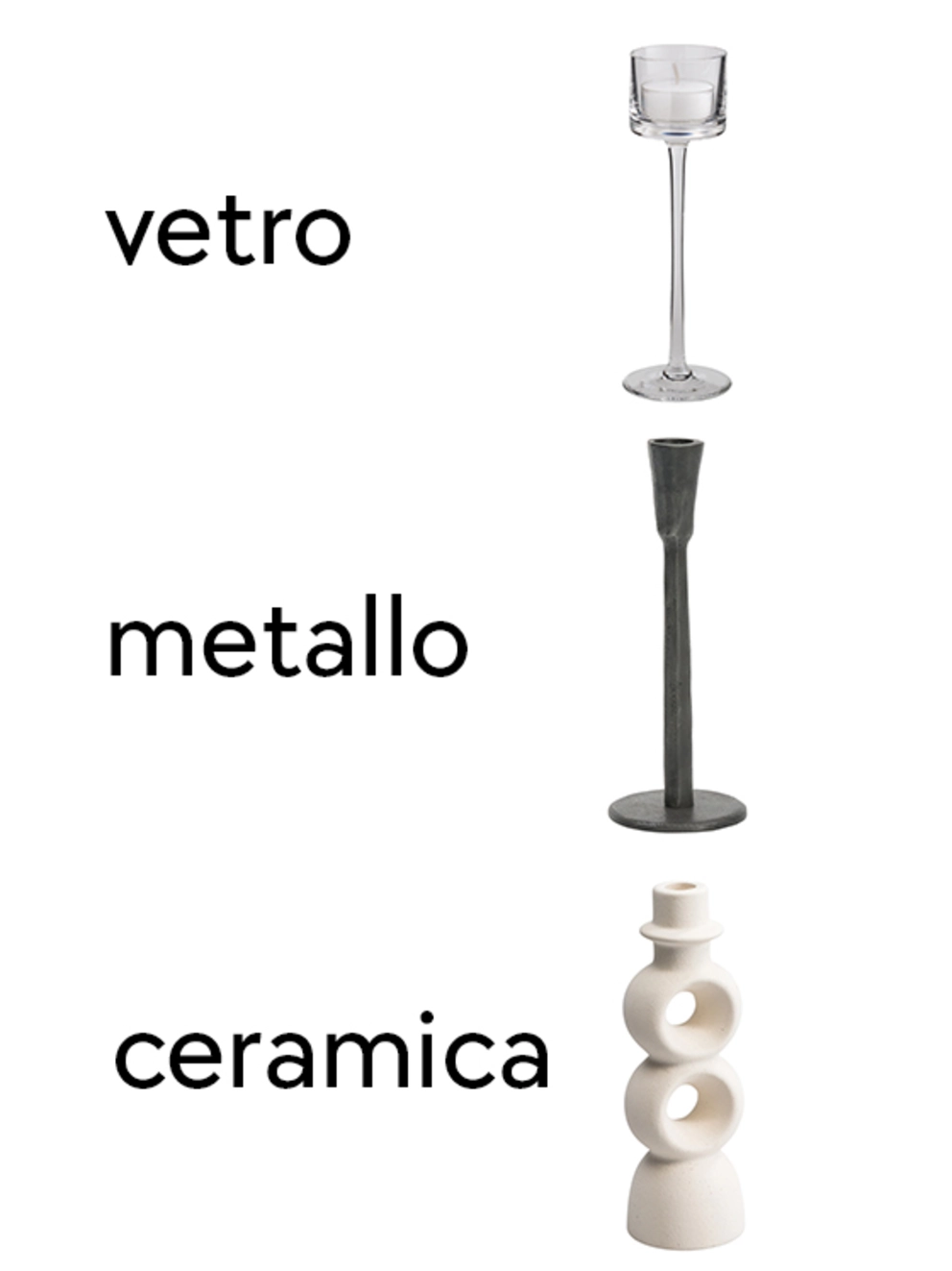 I portacandele sono solitamente in materiali ignifughi come il vetro, il metallo o la ceramica e sono naturalmente questi a determinarne in gran parte l’aspetto estetico. La scelta del portacandela dipenderà dal tipo di decorazione natalizia che preferisci: