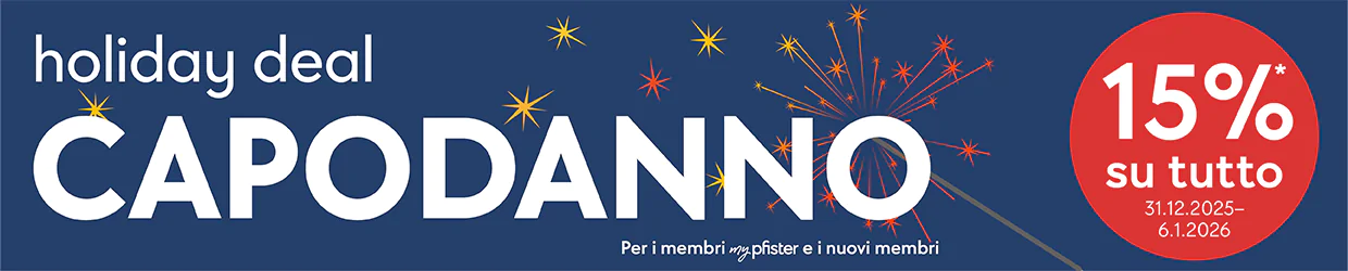 ** 15% su tutto per i membri mypfister e i nuovi membri. Valido dal 31.12.2025 al 6.1.2026. Non cumulabile con altre promozioni, non valido per i marchi Artemide, Biohort, brühl, Glatz, HAY, Intertime, Jan Kath, Leolux, one, Schaffner, Schlossberg, TEAM 7, WILLISAU, Zumsteg e la sedia WILA NFT Limited Edition, 220.873.5, né per articoli online only, servizi, buoni regalo e ordini già emessi. Incluso bonus membri mypfister del 2%.