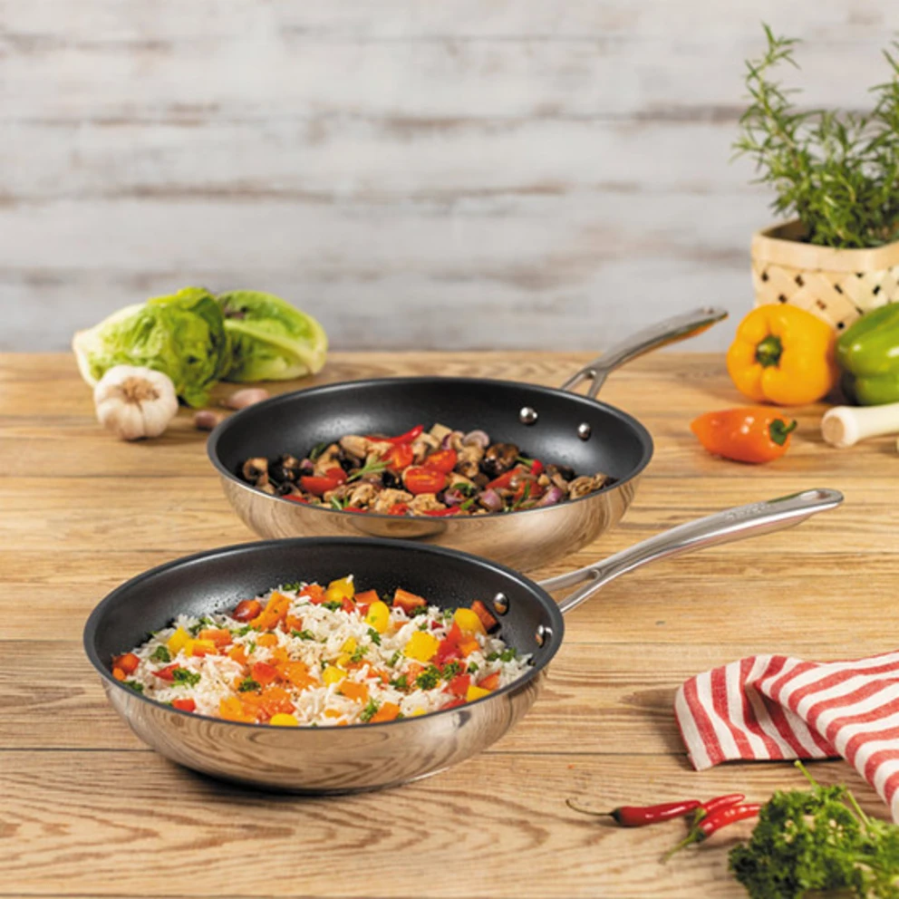 Che tu sia dilettante o professionista, una padella di qualità da usare in modo versatile deve far parte della tua attrezzatura di base in cucina. Il rivestimento evita che i cibi si attacchino al fondo o ai bordi, permettendoti di preparare patate in padella, crêpe o uova, anche senza molta esperienza. In un tegame con due manici laterali puoi rosolare ortaggi croccanti e portare le tue creazioni direttamente in tavola per servirle ancora calde. Per la carne, usa una bistecchiera: grazie alle scanalature sul fondo, puoi cuocere bistecche o salsicce come su una griglia, formando così una deliziosa crosticina esterna mantenendo i succhi all'interno. Se desideri preparare uno stufato, ricorri a una casseruola per stufati. Prima rosola bene la carne, poi cuocila lentamente coperta di liquido. Gli appassionati di cucina asiatica non possono fare a meno del wok. La sua forma concava e il bordo particolarmente alto permettono di saltare tofu, carne e verdure.
