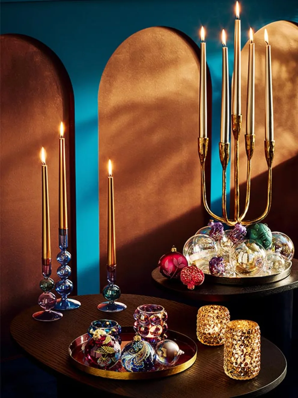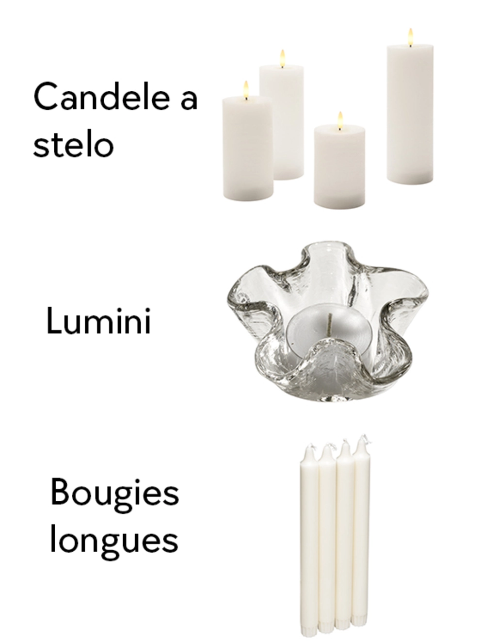 - Candele a stelo per Natale: durante una merenda a base di Baumkuchen e caffè insieme ai tuoi cari in un pomeriggio d’Avvento oppure accanto al ricco menu di Natale, le alte e slanciate candele a stelo sistemate in appositi portacandele natalizi fungono da elegante richiamo visivo sulla tavola apparecchiata a festa.