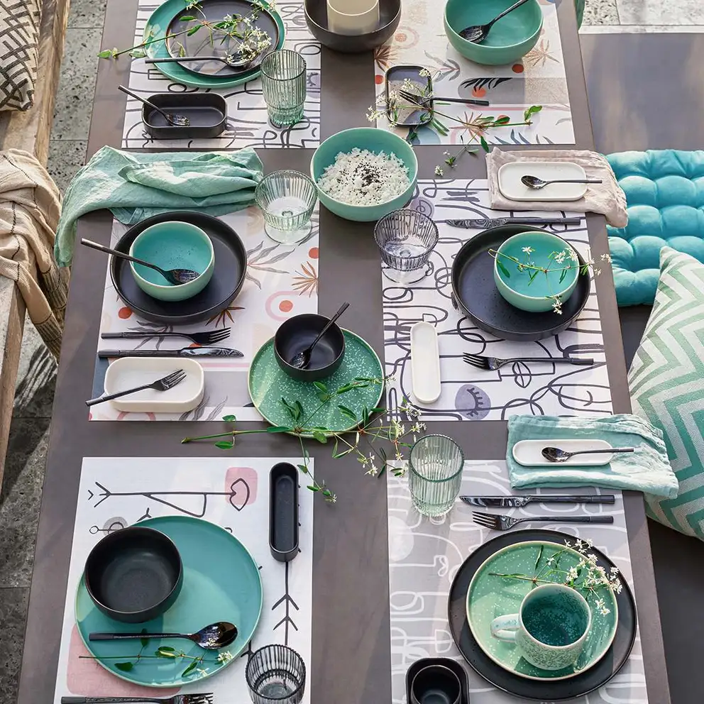 Il piatto, di solito un sottopiatto, è il centro di ogni posto destinato a un commensale, intorno al quale vanno distribuite le posate. In linea di principio vale quanto segue: la forchetta è a sinistra, il coltello e il cucchiaio sono a destra. Se vengono servite più portate, la disposizione delle posate segue la sequenza delle portate: quindi, quando apparecchi inizi dall’esterno con le posate per l’antipasto, lavori verso l’interno con il coperto per la portata intermedia fino ad arrivare a ciò che serve per il momento culminante e principale del menù, cioè gli strumenti che andranno collocati vicino ai lati del piatto, quindi nel punto più interno. Le posate per il dessert hanno il loro posto in alto sopra il bordo superiore del piatto: la forchetta per il dolce indica verso destra, il cucchiaino da dolce, posto al di sopra, in senso opposto, quindi verso sinistra. Seguendo questo principio, anche quando sei ospite in casa d’altri o al ristorante, sai sempre qual è il lato giusto.
