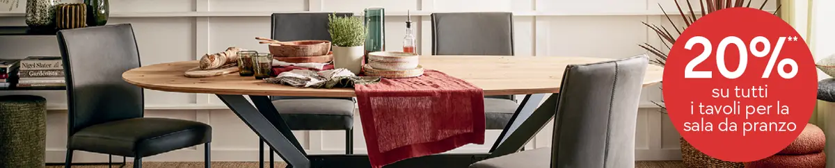 ** Valido per i membri mypfister e i nuovi membri. 20% su tutte le lounge da giardino, i divani e le poltrone, tavoli per la sala da pranzo, letti Boxspring, stoviglie, nonché sul marchio Sigor e sulla biancheria da letto di edy&liv. Valido dal 3 fino al 23.3.2026. Non cumulabile con altre promozioni, non valido per i marchi Biohort, BICO, Fatboy, Glatz, Lafuma, one, riposa, Schaffner, Talenti, TEAM 7, WILLISAU e Zumsteg, né per articoli Online Only, Mobitare, servizi, buoni regalo e ordini già emessi. Incluso bonus membri mypfister del 2%.